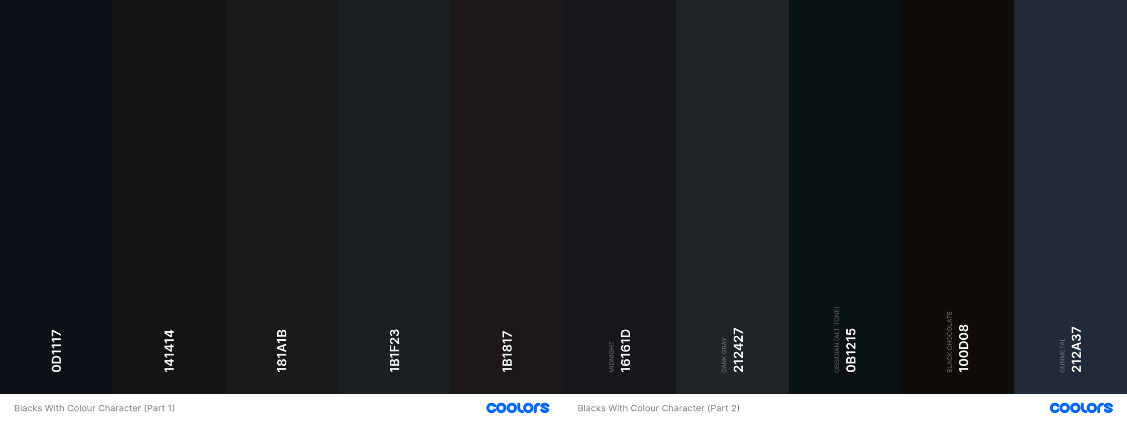 Ten near-blacks that actually behave like colours. These aren’t defaults. They’re moody, shaded, and full of personality. Shown in two parts because Coolors can’t handle this much range in one go.