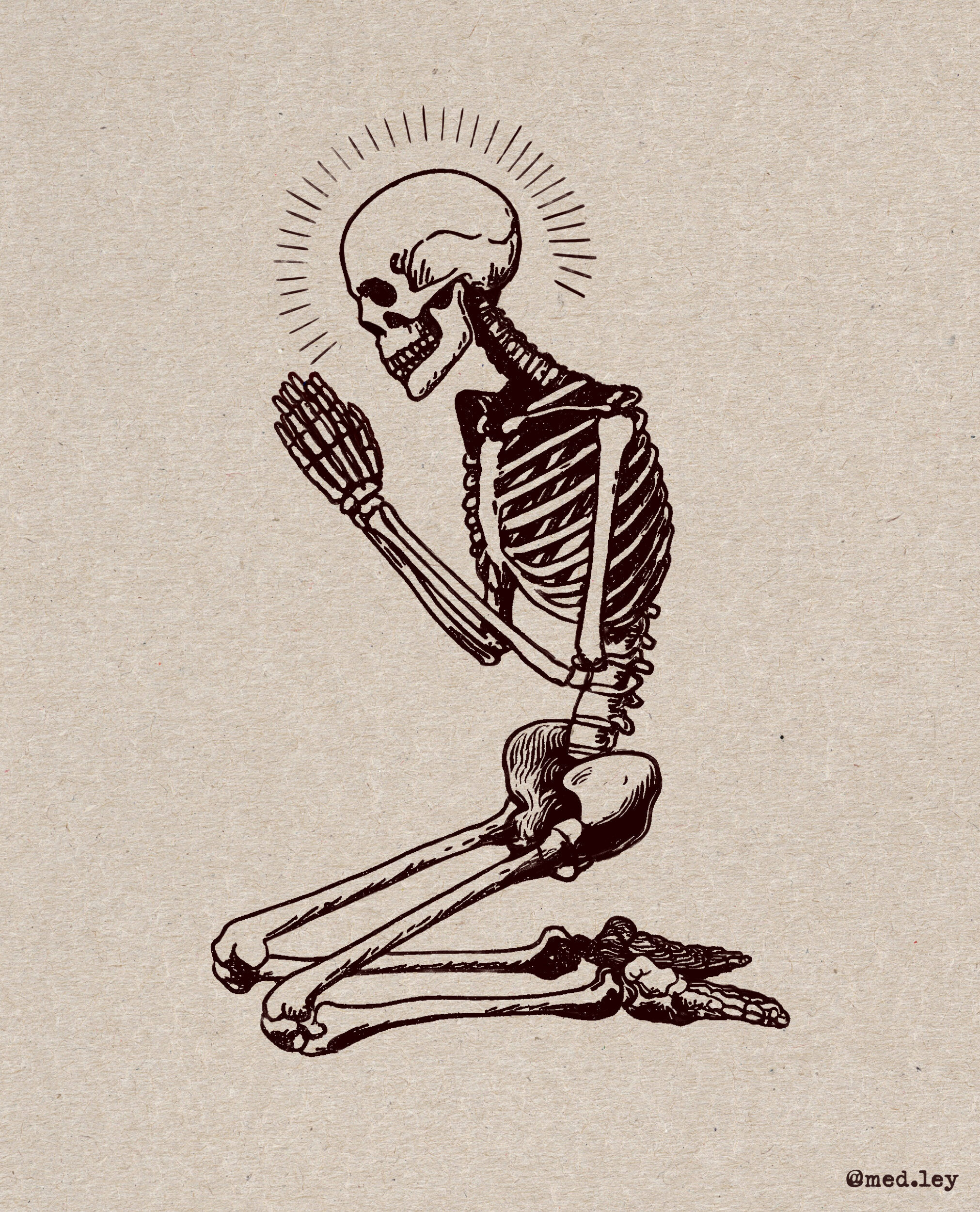 Oratio Ossium (Prayer of the Bones) Knees weak, bones heavy. Just a skeleton doing his best. Drawn in Procreate, watch the 30-second time-lapse if you’re into bones, lines, or guys who overthink. Timelapse of the illustration process: View this post on Instagram A post shared by AKA Medley (@med.ley) 🛒 Buy the Print: Grab a fine art print of Oratio Ossium (Prayer of the Bones). Minimalist, monochrome, and slightly haunted. Date: October 25, 2023 Category: Tattoo Design Tags: Skeleton TattooSkull tattoo
